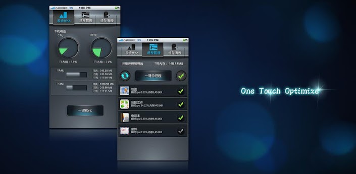 One Touch Optimize is a cell phone tool which can help you to optimize the phone system effectively by ending unnecessary processes and clearing cache data generated in the process to achieve system optimization function. You can quickly optimize the system by Desktop widget, very easy to use!